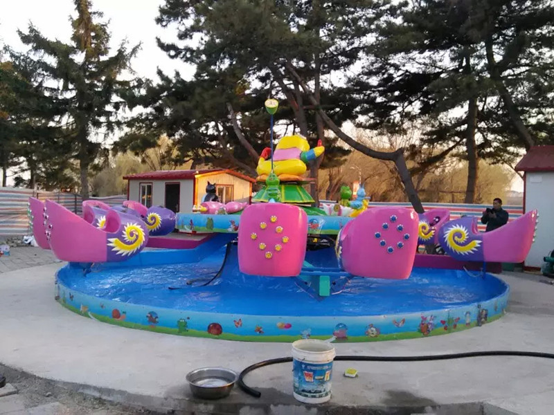 本設備為無基礎可移動的兒童游樂設備,適合商場、場和公園使用,因為蝸牛特工隊的占地面積不大,而且在6個大臂上有著12個座艙,可以容納12個成年人同時游玩,而且在同時,每個蝸牛殼座艙上面都有著個可以打水的蝸牛噴水槍
